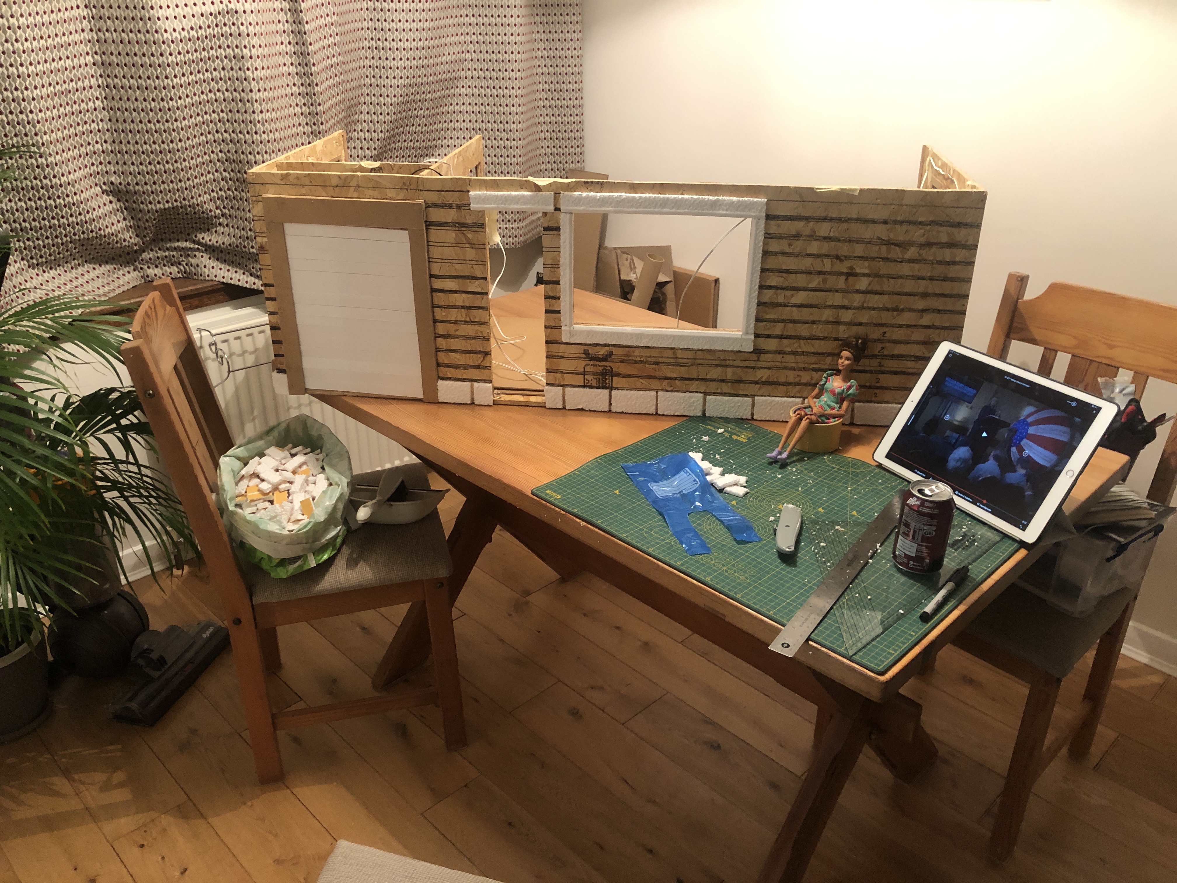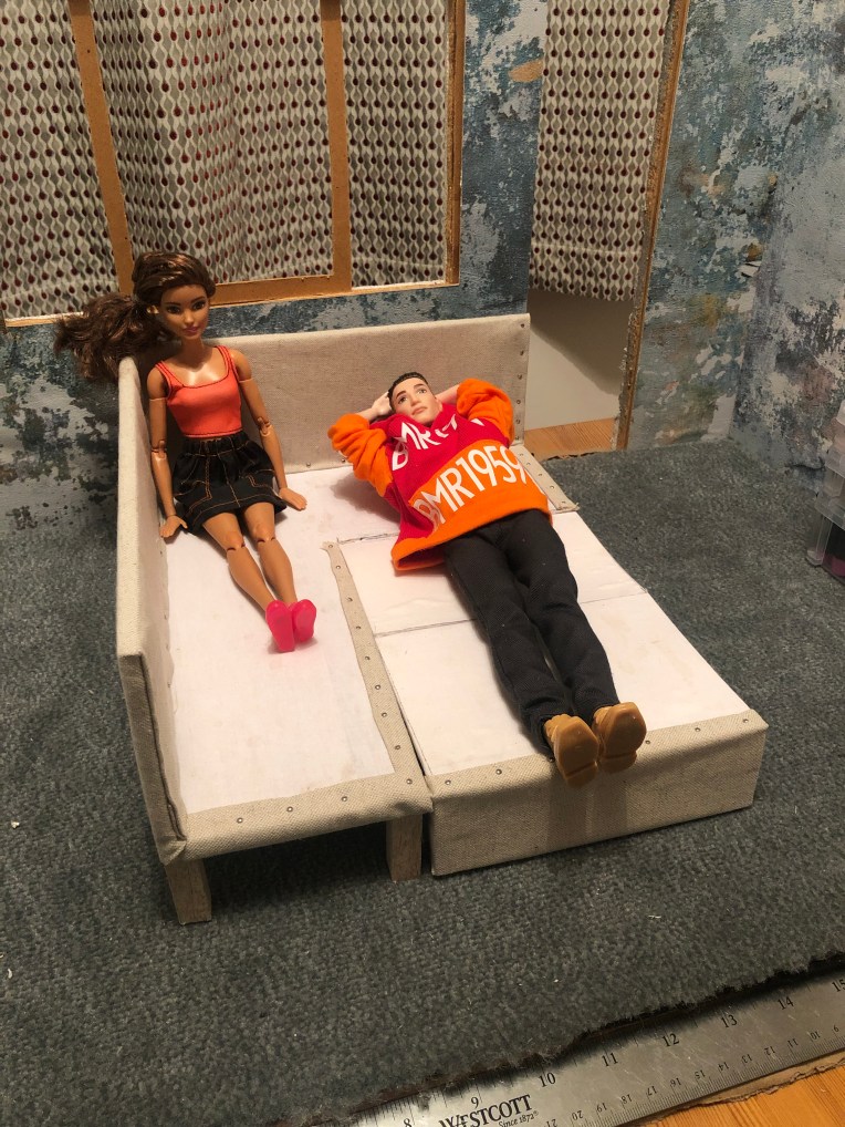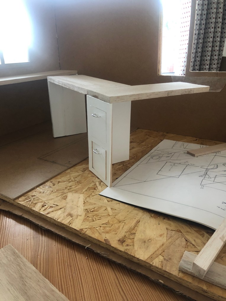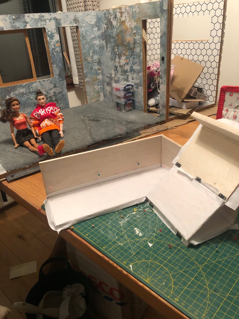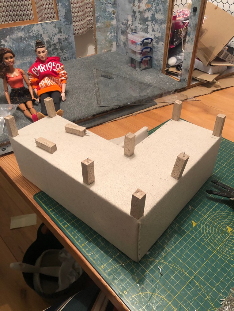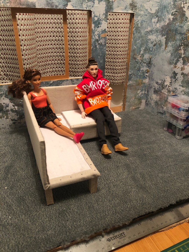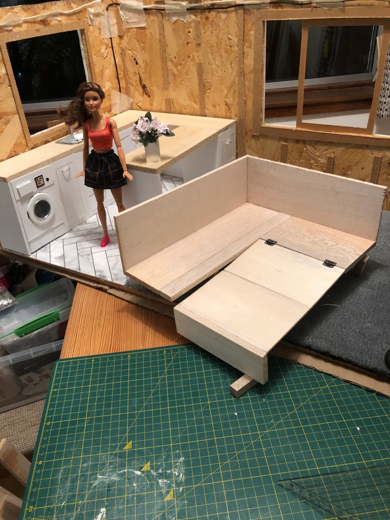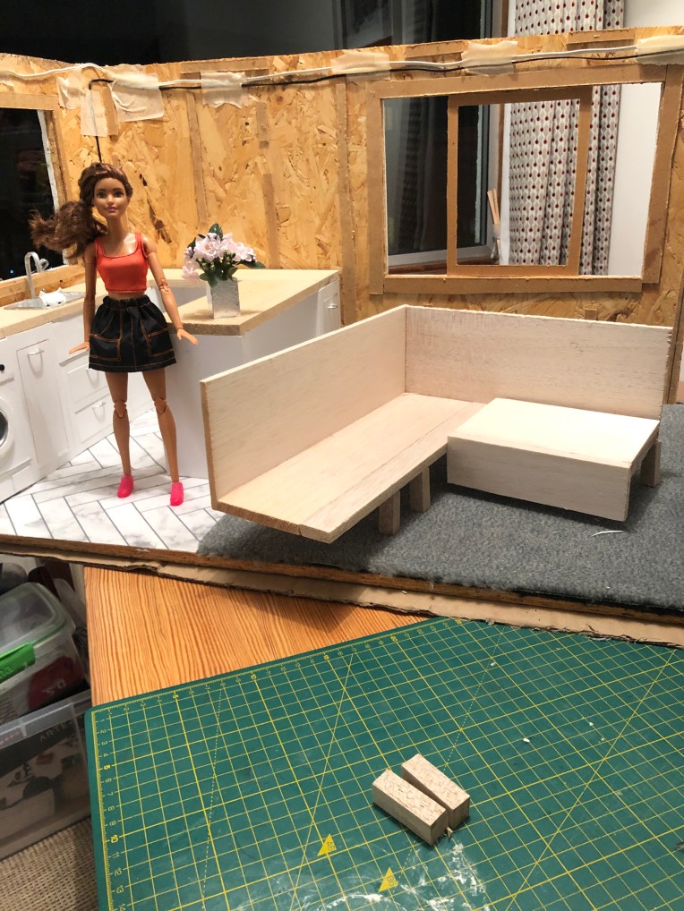 The below photos are from September, I continued on with the couch, creating 7 pillows: making them work as pillows and also creating the double bed. I then went back to the kitchen to work on some roller blinds using hooks, material and a craft chain.
