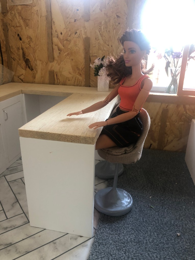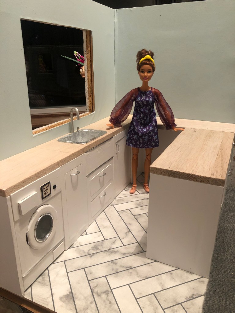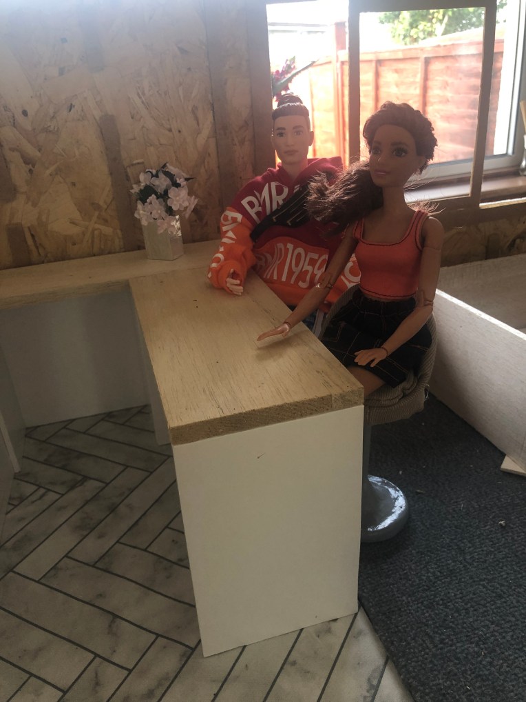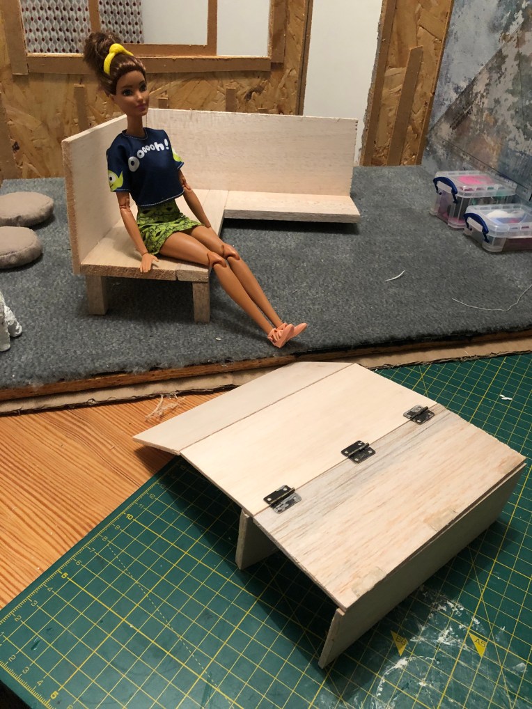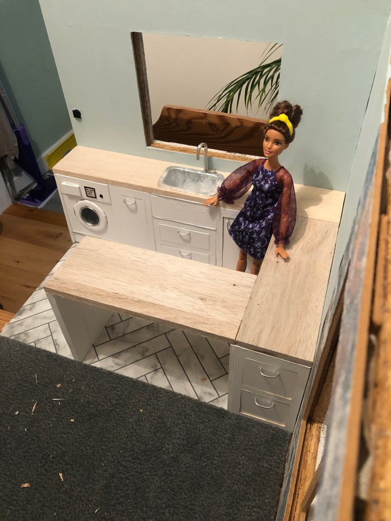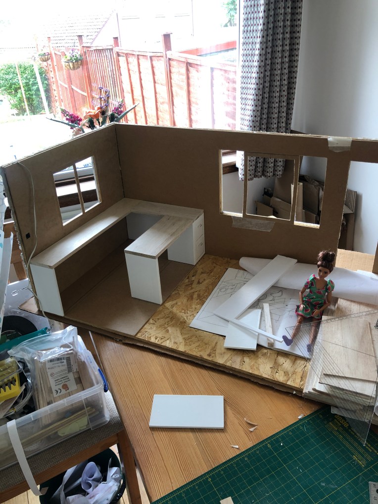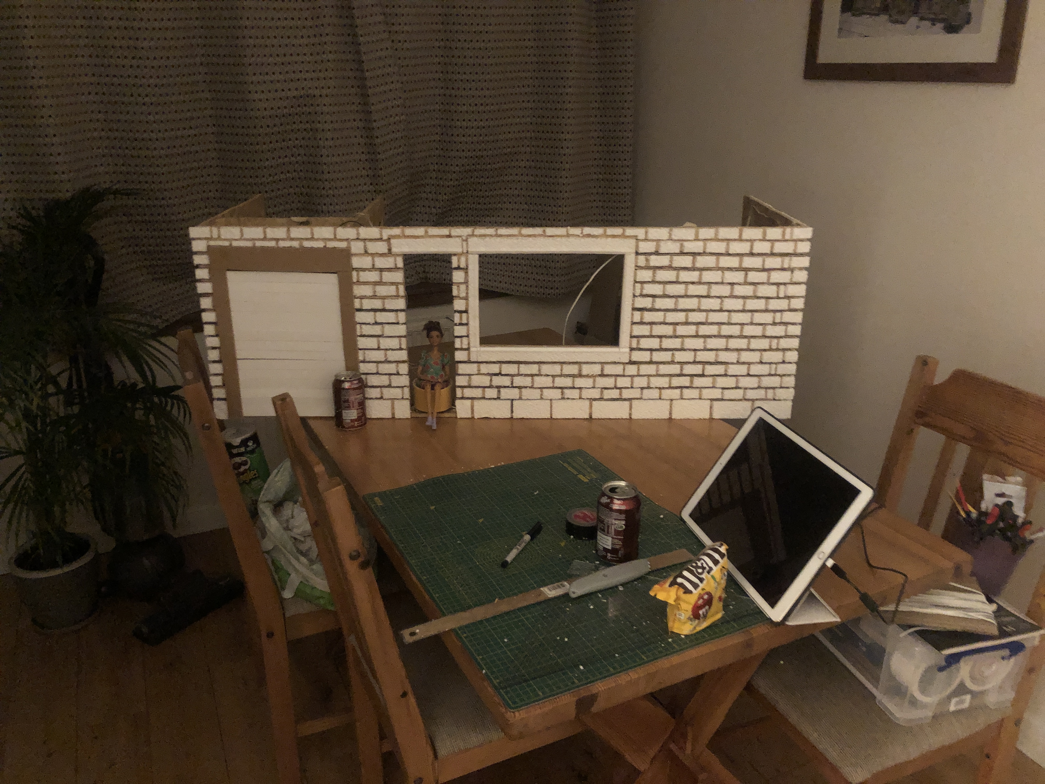 The below photos are from September, I continued on with the couch, creating 7 pillows: making them work as pillows and also creating the double bed. I then went back to the kitchen to work on some roller blinds using hooks, material and a craft chain.
