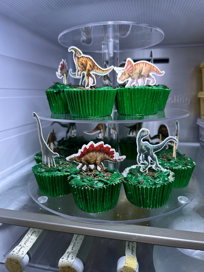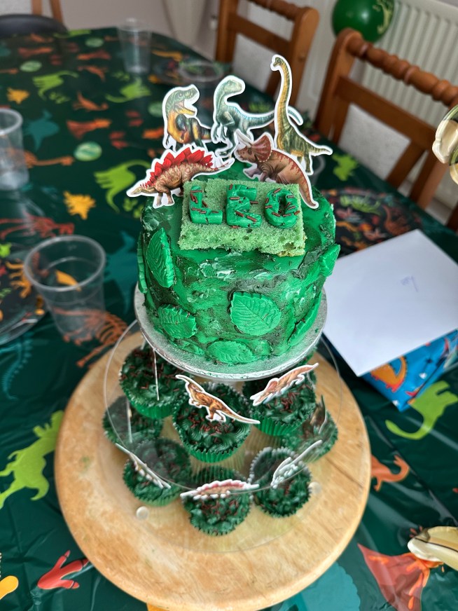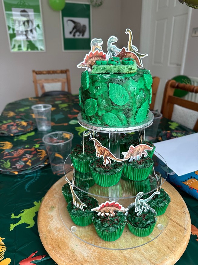 I love throwing parties and Leo birthday was no exception. He love Jurassic park so I used that as the theme. I made a cute Birthday banner for over the table decorations and big prints for the walls. The cake is Gluten free 6″ and 14 small cupcakes around the bottom. I used images of Leos fav dino to create a pop up card to surprise him. I love how everything turned out.