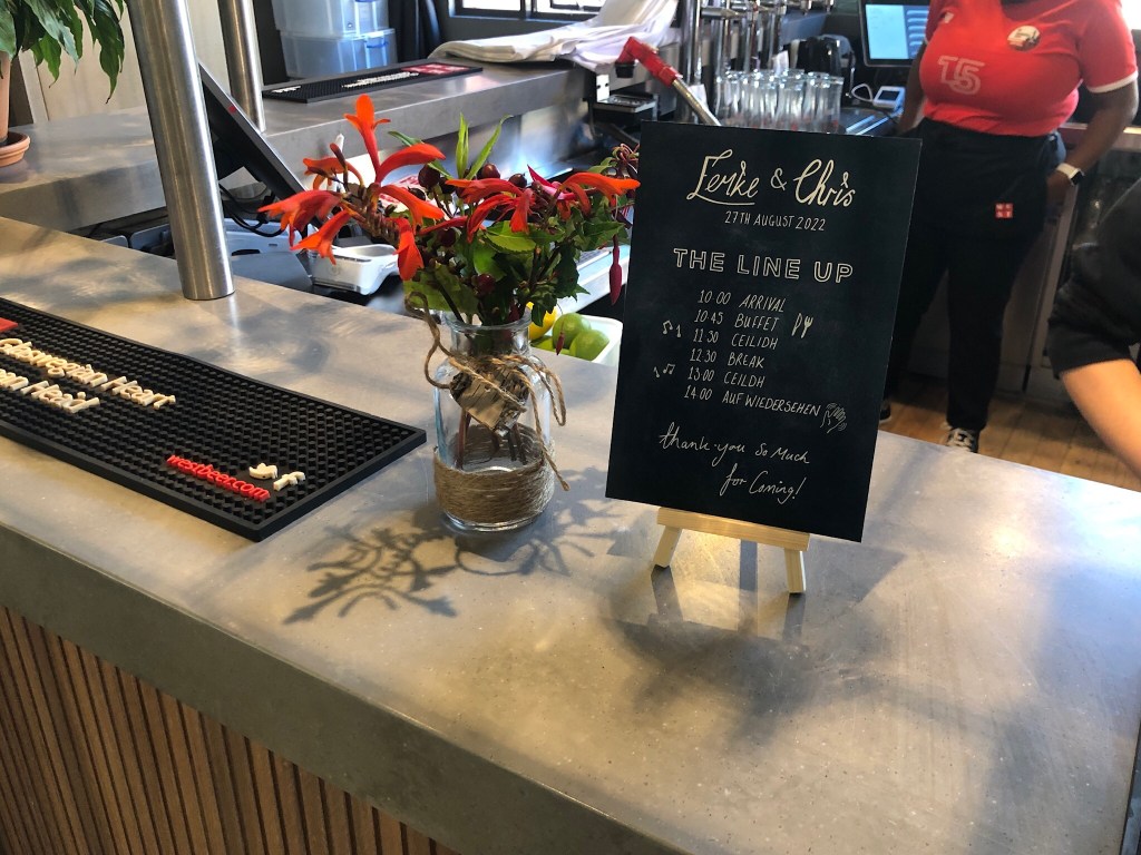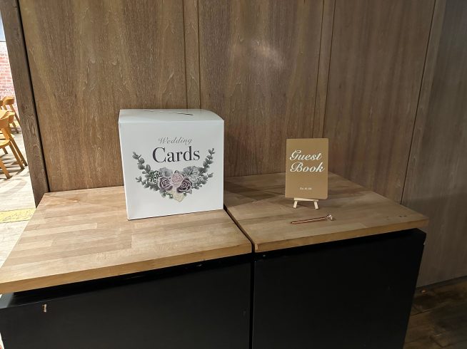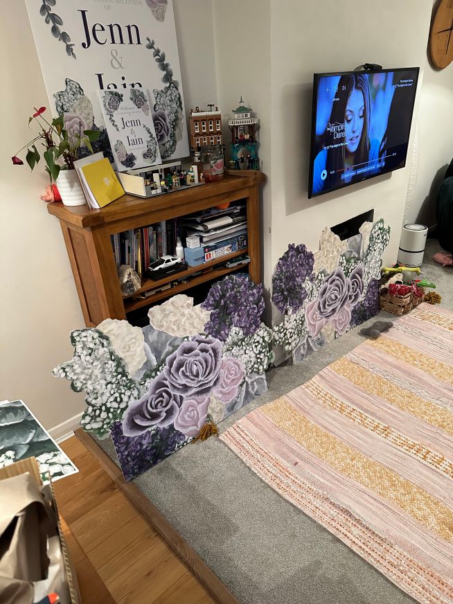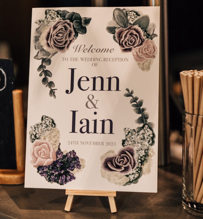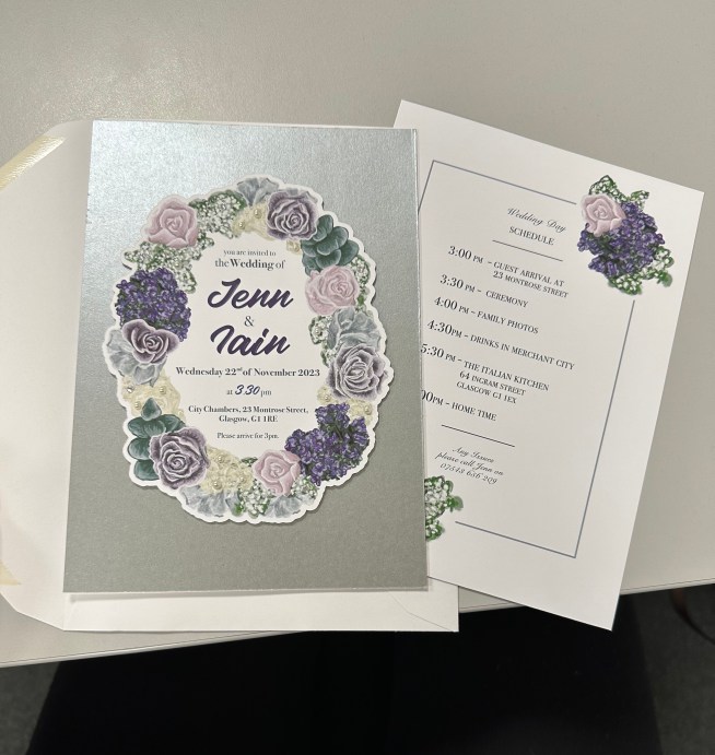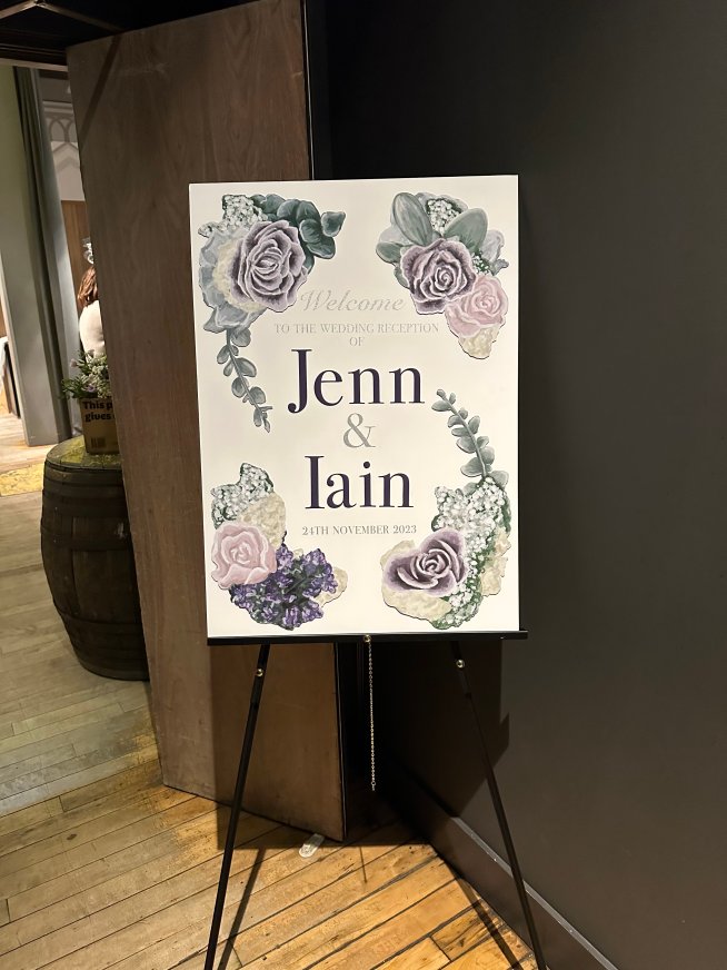 In September 2023 (23.09.23) Iain finally proposed (after a year of pestering) I didn’t want to wait any longer and had lots of ideas. I picked the flowers for my bouquet for the wedding and then drew them out as I wanted everything to tie in. The flowers were drawn as separate elements that I could then move about depending on what they were going on (to brand each stationery item). I was thinking of the bigger picture; invites, A1 welcome board, card box, cards for food, A5 table schedules, A4 welcome boards and A1 displays for the windows.