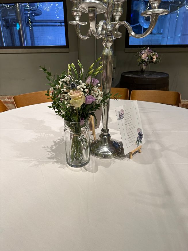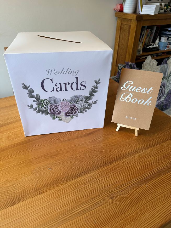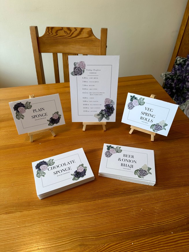 The content below showcases a beautiful and cohesive setup for our wedding reception, with a nice combination of purple and grey colours. The use of the same flowers and illustrations as on the wedding invite helps tie everything together. We chose the colours because I love purple and Iain loves grey and both colours work well together. The addition of the custom-made Lego cake topper adds a personal and fun touch to the celebration. (I used set 40165 and series 7 mini figure bagpiper). I have used a combination of foamex, matt 210g paper and vinyl to create the below items: